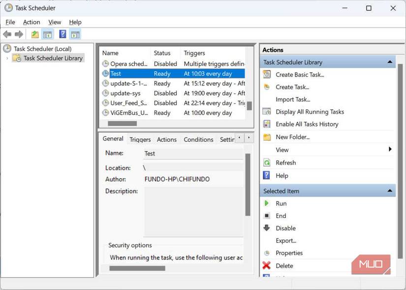 To do that, open Task Scheduler (as shown above) and select the task you automated, which will be in the middle panel. In the right panel, under Actions, click on either Disable to stop it for now or Delete to remove it from Task Scheduler.