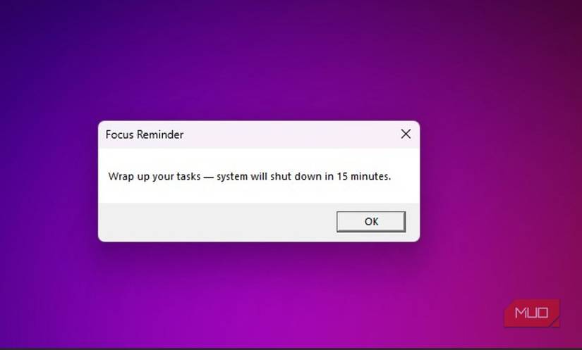 -ExecutionPolicy Bypass -WindowStyle Hidden -Command "Add-Type -AssemblyName PresentationFramework; [System.Windows.MessageBox]::Show('Wrap up your tasks — system will shut down in 15 minutes.', 'Focus Reminder')"