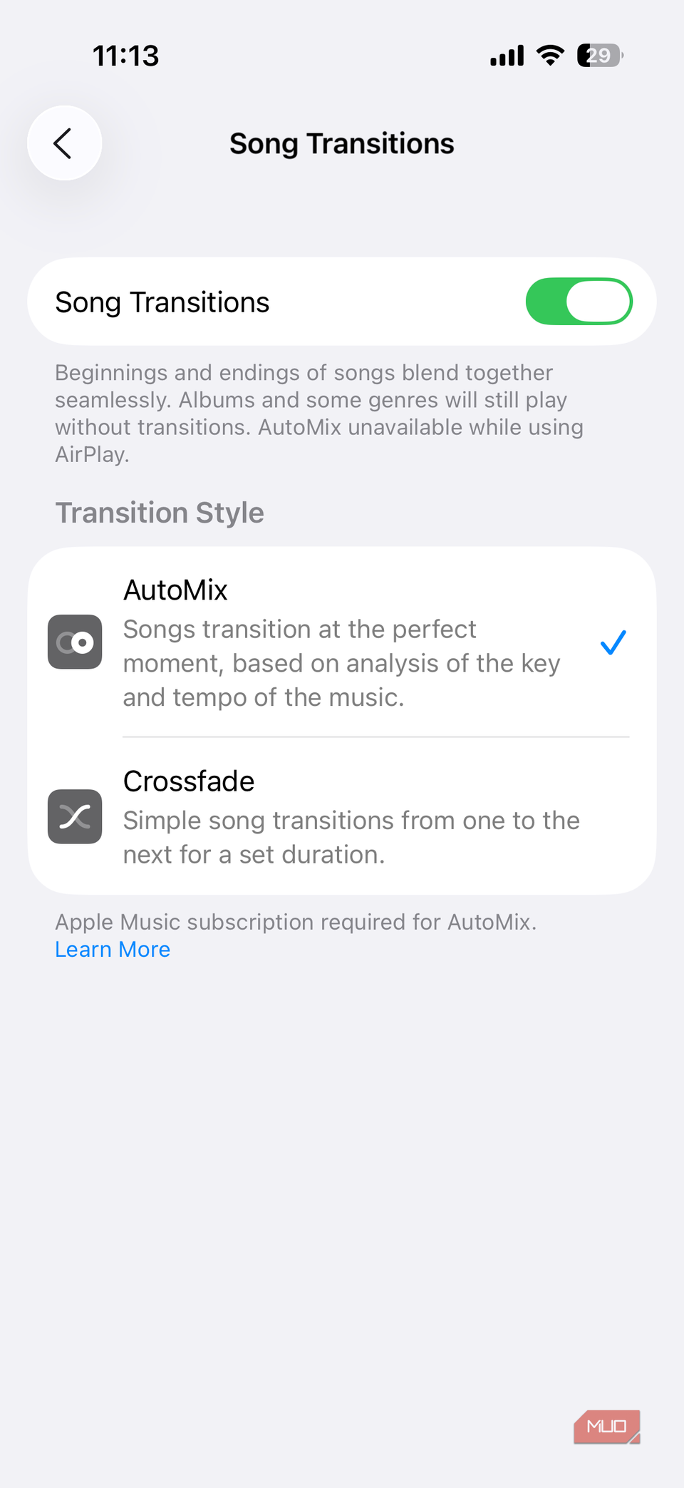 To turn it on, head to Settings > Apps > Music > Song Transitions, enable the toggle, and set the Transition Style to AutoMix. iOS 26 also adds several other upgrades to Apple Music, including lyrics translation, lyrics pronunciation, music pins, and more.