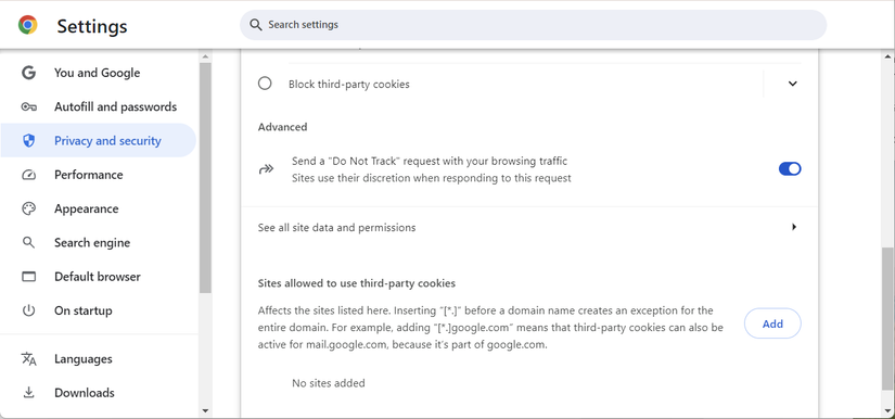 Once activated, this option requests websites to stop tracking your activities and displaying personalized ads. However, not all websites comply with the "Do Not Track" directive, meaning targeted ads may persist.