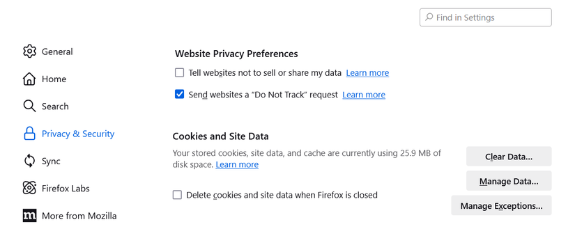 - Under Website Privacy Preferences, choose Send websites a "Do Not Track" request.