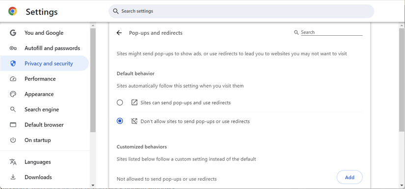 - Go to Settings > Privacy and security > Site settings > Pop-ups and redirects.
