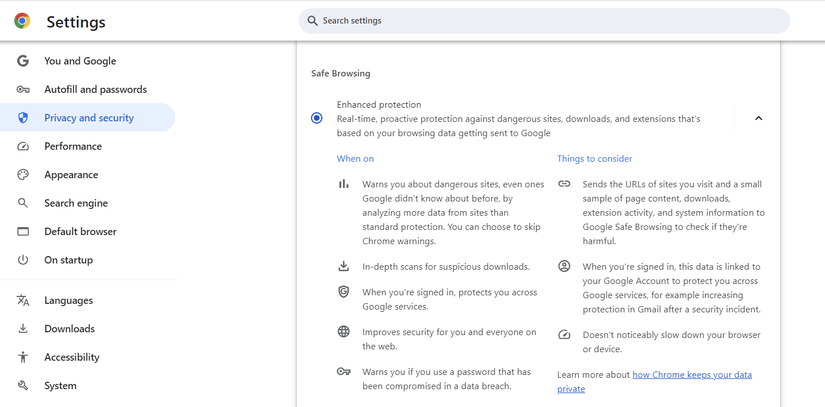 Safe browsing practices, such as regularly updating software, avoiding suspicious links, and using strong passwords, can protect you from most online threats. However, sometimes, these measures aren't enough. In your browser, you can enable enhanced protection settings for added security.