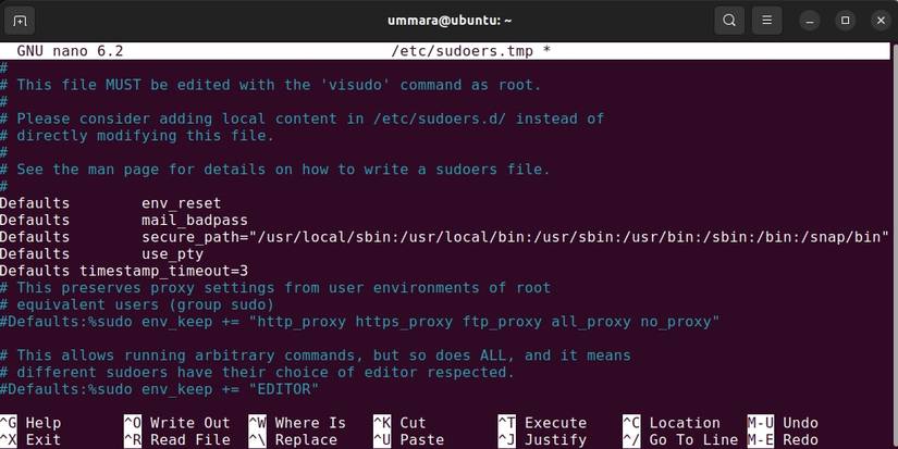 Let’s say you want to shorten the sudo password timeout to three minutes, so you will add: