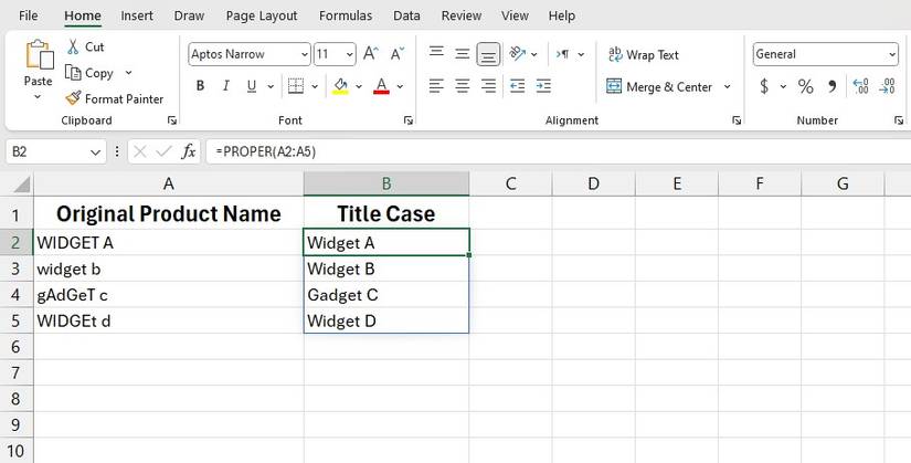 The PROPER function comes in handy when you need title case—where the first letter of each word is capitalized.