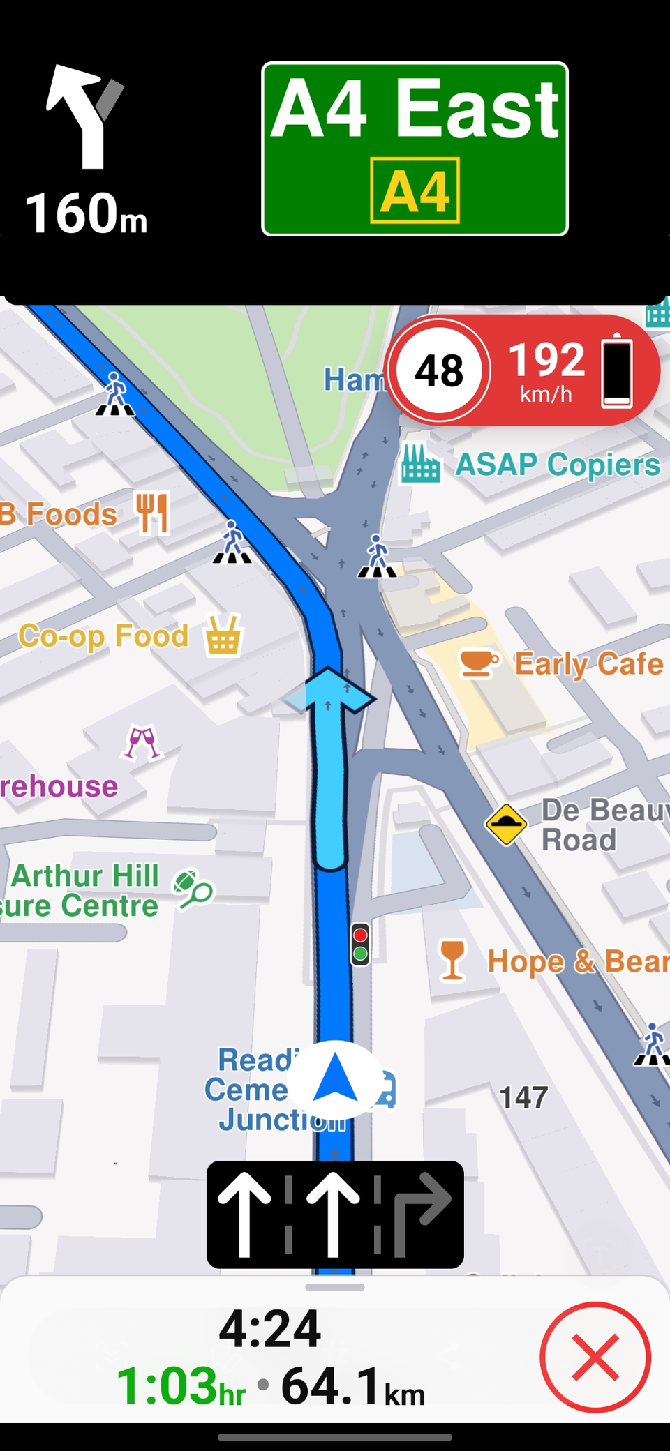 The interface looked familiar and struck me as combining the best elements of Google Maps and Waze. Like Waze, it’s bold, well color-coded, and prominently displays hazards like traffic lights, speed cameras, and pedestrian crossings. Like Google Maps, it displays essential data without the cartoonish interface and distracting traffic alerts. I liked the large road signs, the inset speedometer, the bold direction arrows and trip data, and the fact that it tells you exactly which lane to be in when necessary.