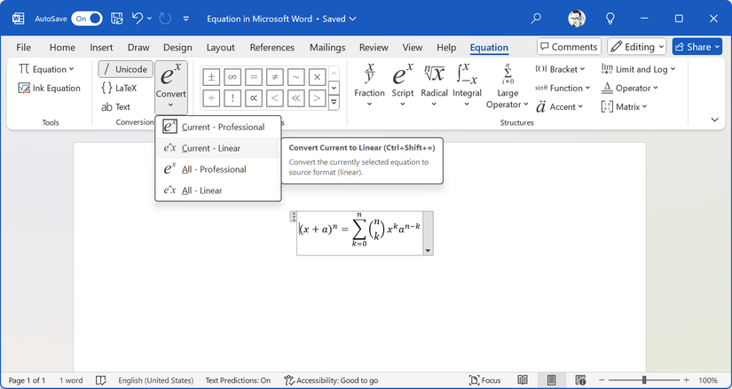 The good thing is that any equation can be converted from one format to the other (and also convert all equations in one go with the All-Professional and All-Linear options).
