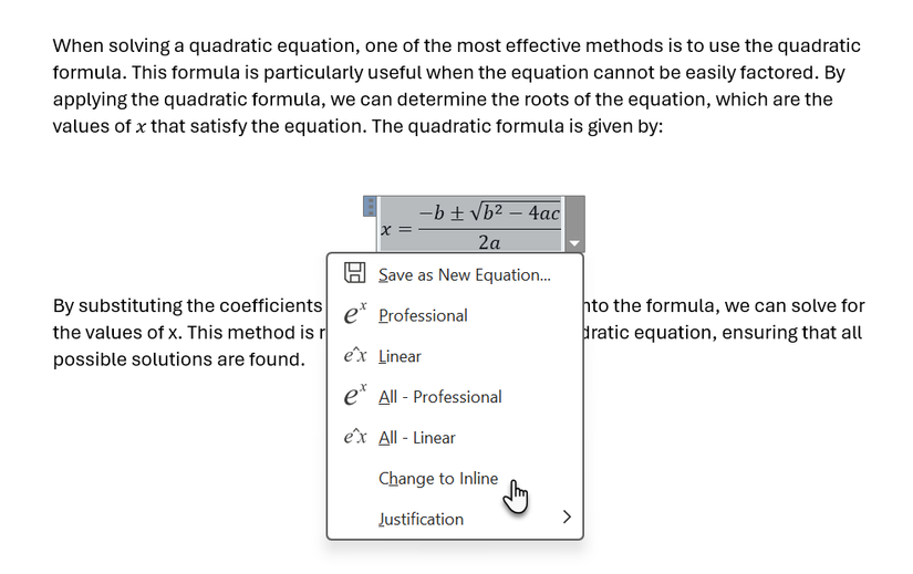 However, the Inline format might be ideal for simpler and one-off equations within a text-heavy paragraph.