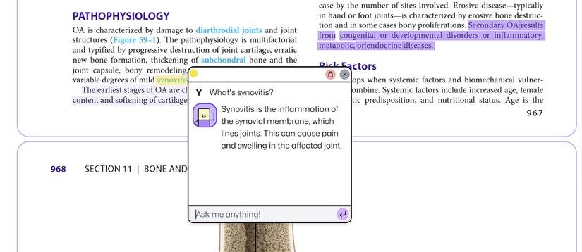 FlashKa also marks parts of the text with a yellow circle if an explanation or question has been associated with it. This visual cue helps track areas of difficulty and provides quick access to previously sought explanations.