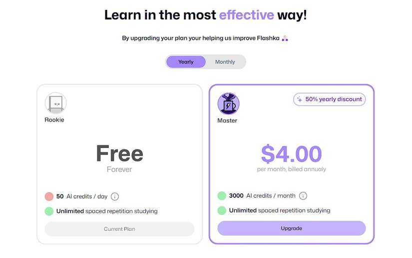 FlashKa operates on a credit system, offering 50 free credits per day, which I've found generally sufficient for daily study sessions. For instance, asking for an explanation on a flashcard uses one credit.