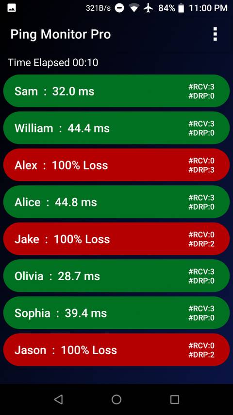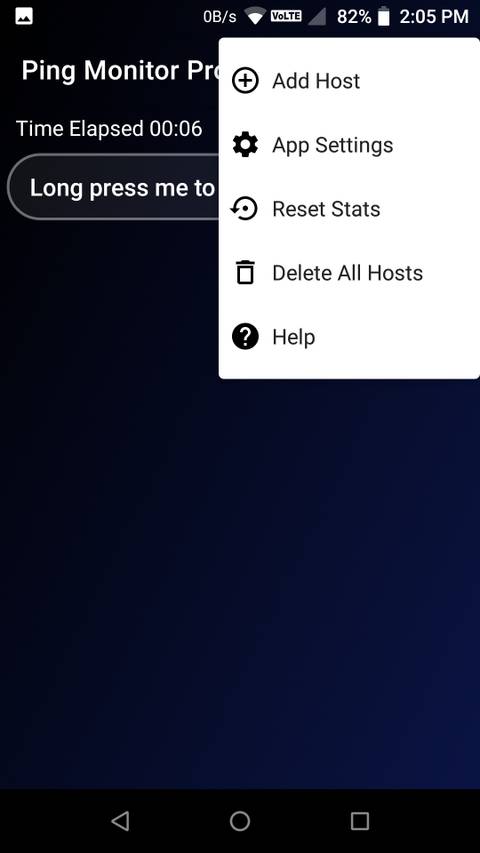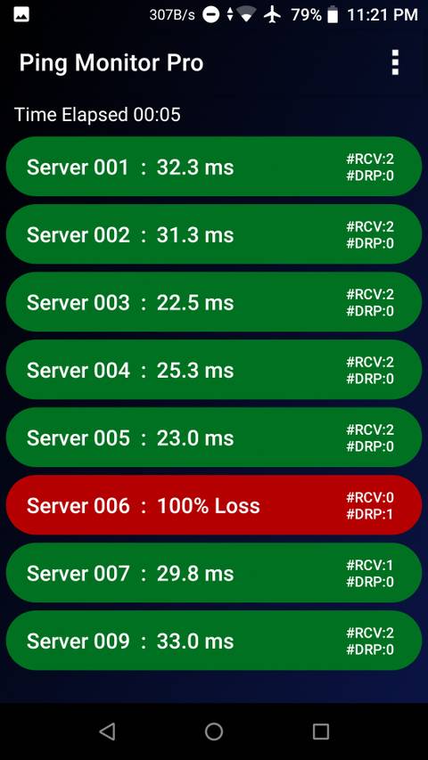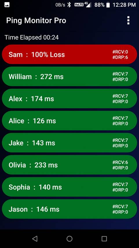 Save it, and you have just completed setting up the first host. The app will show ping time and the number of total pings and failures. When the host is up, the tab is shown in green and turns red when the host is down.