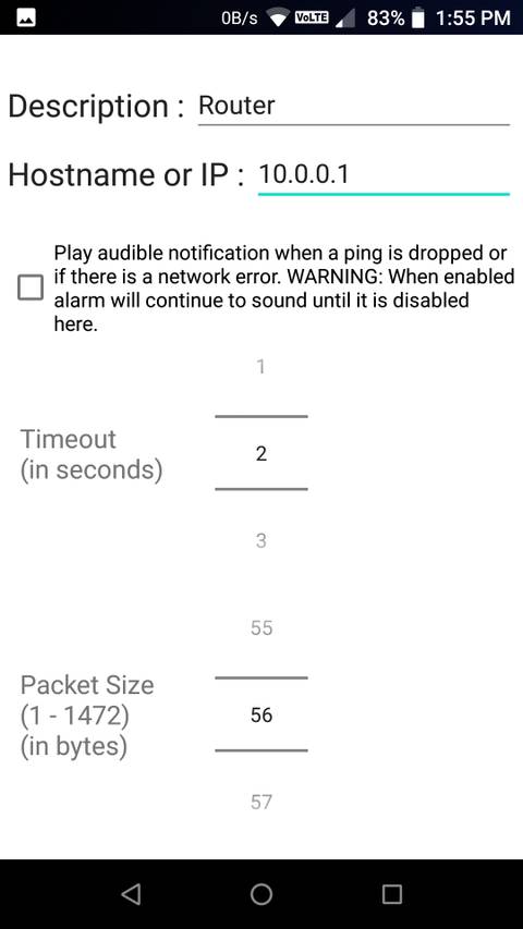 To set up the first monitor, select Add Host from the menu. Give a Name for the host and its IP Address (here's how to find an IP address using a smartphone). You can leave the Timeout and Packet Size to default; more about this later. You can choose to Play Audible Notification if the host is down, a feature that is particularly useful while monitoring servers.