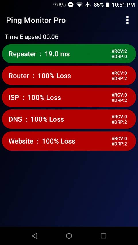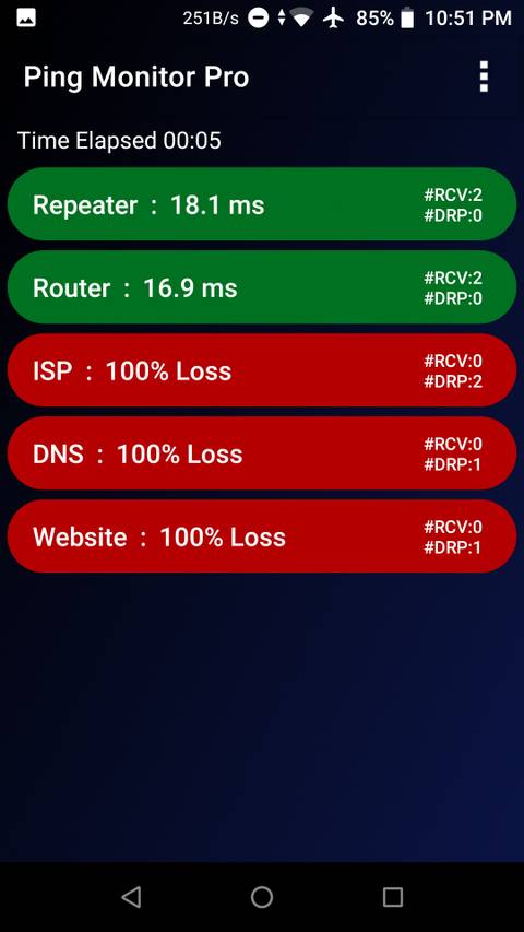 If you have an internet disruption, you can interpret the problematic section of the network with ping results from the dashboard of Ping Monitor Pro. Here are two different examples of a router issue and an ISP issue.