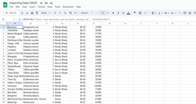 =IMPORTXML("https://www.w3schools.com/xml/plant_catalog.xml", "CATALOG/PLANT")