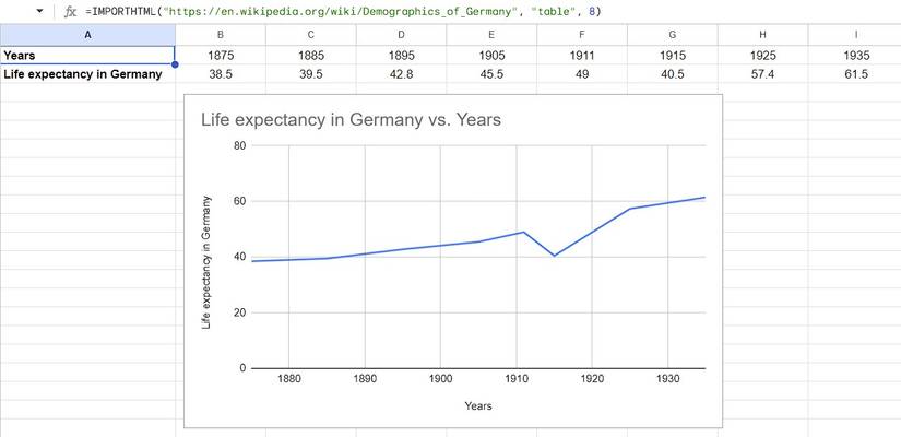 In this formula, IMPORTHTML goes to the specified URL, fetches the data, and outputs the eighth table.