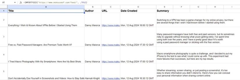 =IMPORTFEED("https://www.makeuseof.com/feed/", ,TRUE)