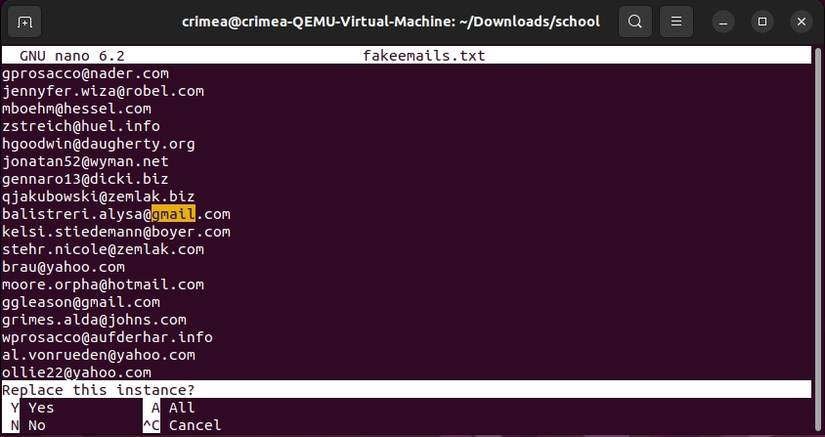 Next, provide a replacement term and press Enter. If there's more than one occurrence of the term to be replaced in the file, you must specify whether you'd like to replace the first or all instances. Press Y to replace the first instance or A to replace all occurrences of the searched term.