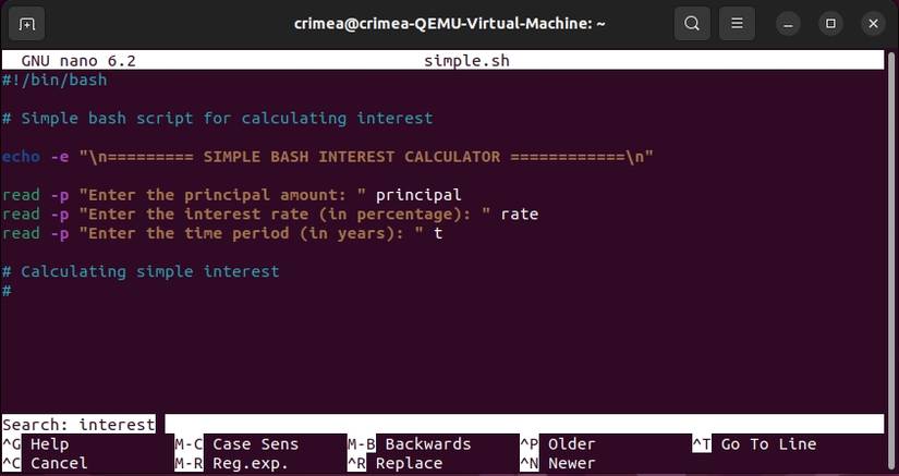 To search for specific text within a file, use Ctrl + W, then enter the search term. By default, nano will only take you to the first matching result, which will be highlighted. However, you can comb through the entire file to find other instances of the term using Alt + W or Option + W (if you're running Linux on a Mac).