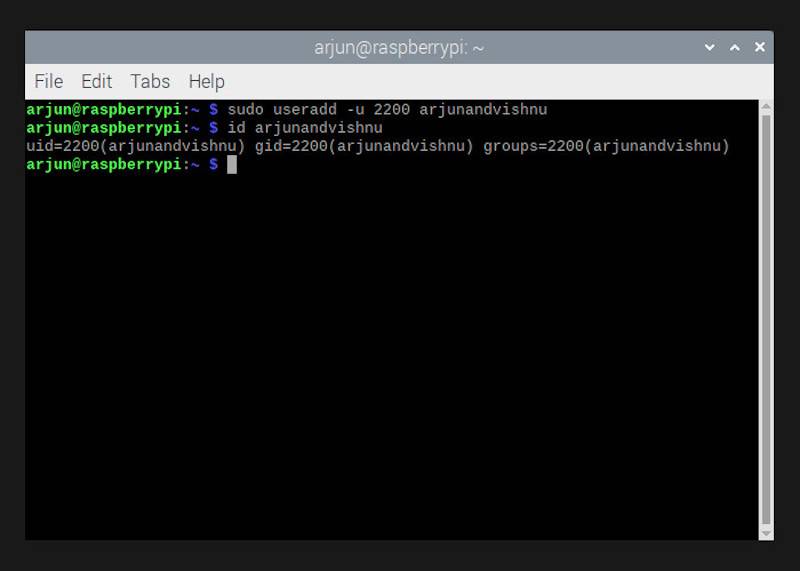 -u specifies UID, 2200 in this case. Once the new user is created, you can check with the id command, which shows UID as well as the groups a user belongs to.