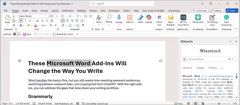 Microsoft's official Wikipedia add-in solves one of the most annoying parts of research—constantly switching between Word and your browser. Instead of juggling tabs, you search and insert Wikipedia content from the Word sidebar.