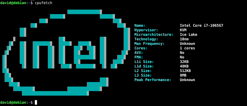 cpufetch is similar to Neofetch, but it displays the logo of your CPU manufacturer instead of the distro logo.