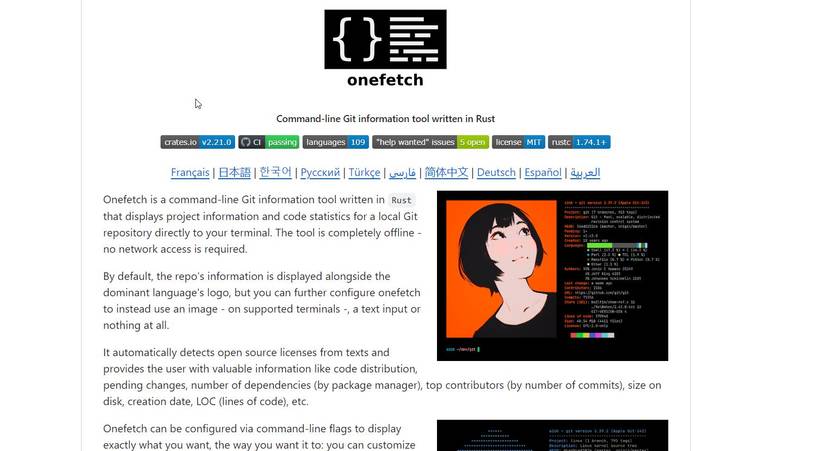 Onefetch is another twist on Neofetch, but with information on Git repositories instead of operating systems. This is of more use to developers than regular users.