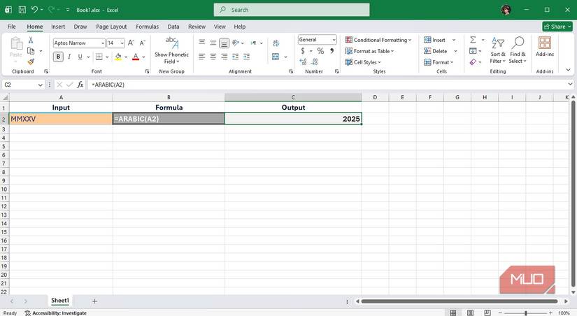 ARABIC reverses the work of ROMAN. It converts a Roman numeral string back to a standard number. For instance =ARABIC("MMXXV") returns 2025. It’s one of Excel’s few "complementary" functions which directly undoes another.