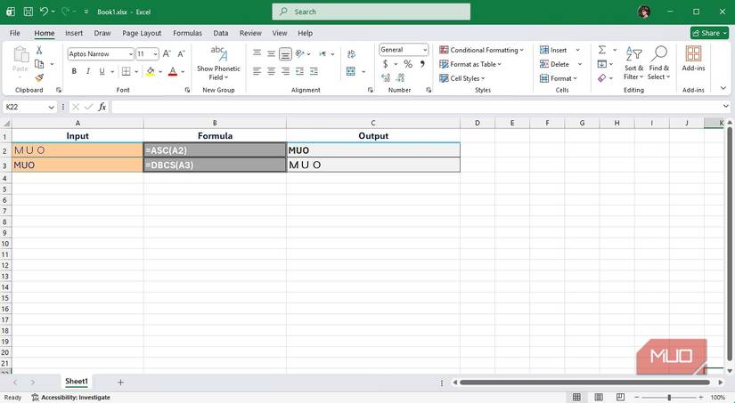 These two functions convert text between double-byte and single-byte character encodings. They exist for legacy East Asian systems that distinguished between half-width (single-byte) and full-width (double-byte) characters. For example, =ASC("MUO") returns the single-byte version MUO. Whereas, =DBCS("MUO") returns the double-byte MUO.