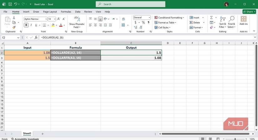 DOLLARDE converts fractional dollar values to decimal form, while DOLLARFR does the reverse. For instance, =DOLLARDE(1.02,16) returns 1.125, and =DOLLARFR(1.125,16) returns 1.02.