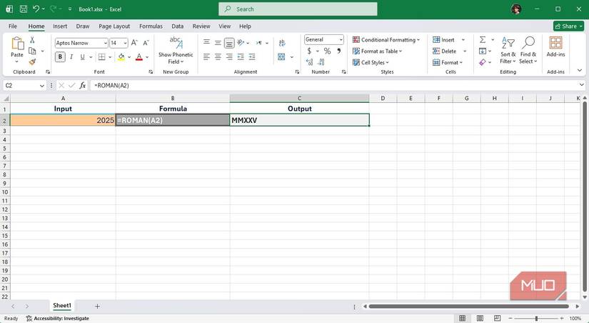ROMAN converts Arabic numerals into Roman numerals. For example, =ROMAN(2025) returns MMXXV. The optional [form] argument (0–4) controls the level of abbreviation. A higher value produces more compact forms (for example, 499 as ID instead of CDXCIX).