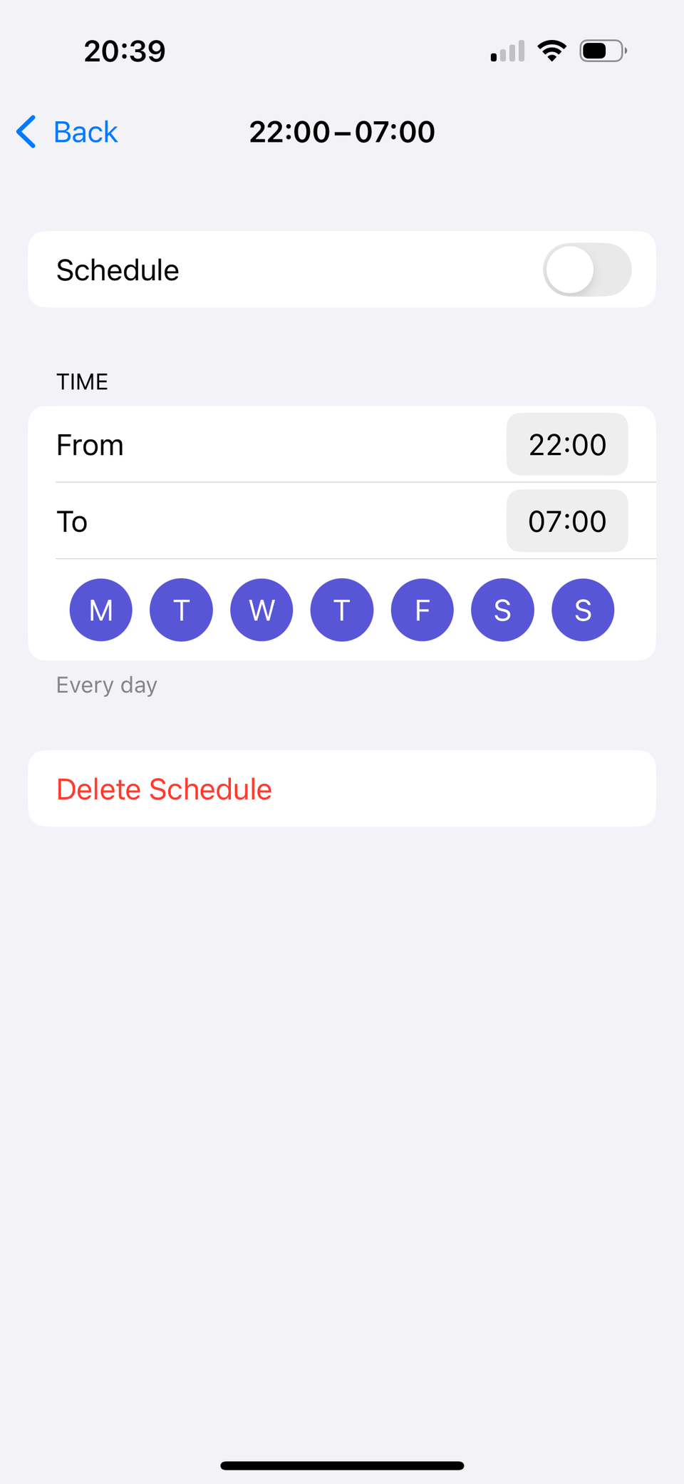 You should also check whether this feature is on a schedule, so head to Settings > Focus > Do Not Disturb. Scroll down to see if there's a schedule set; if so, tap on it and either turn it off by tapping on Schedule or get rid of it completely by tapping Delete Schedule.