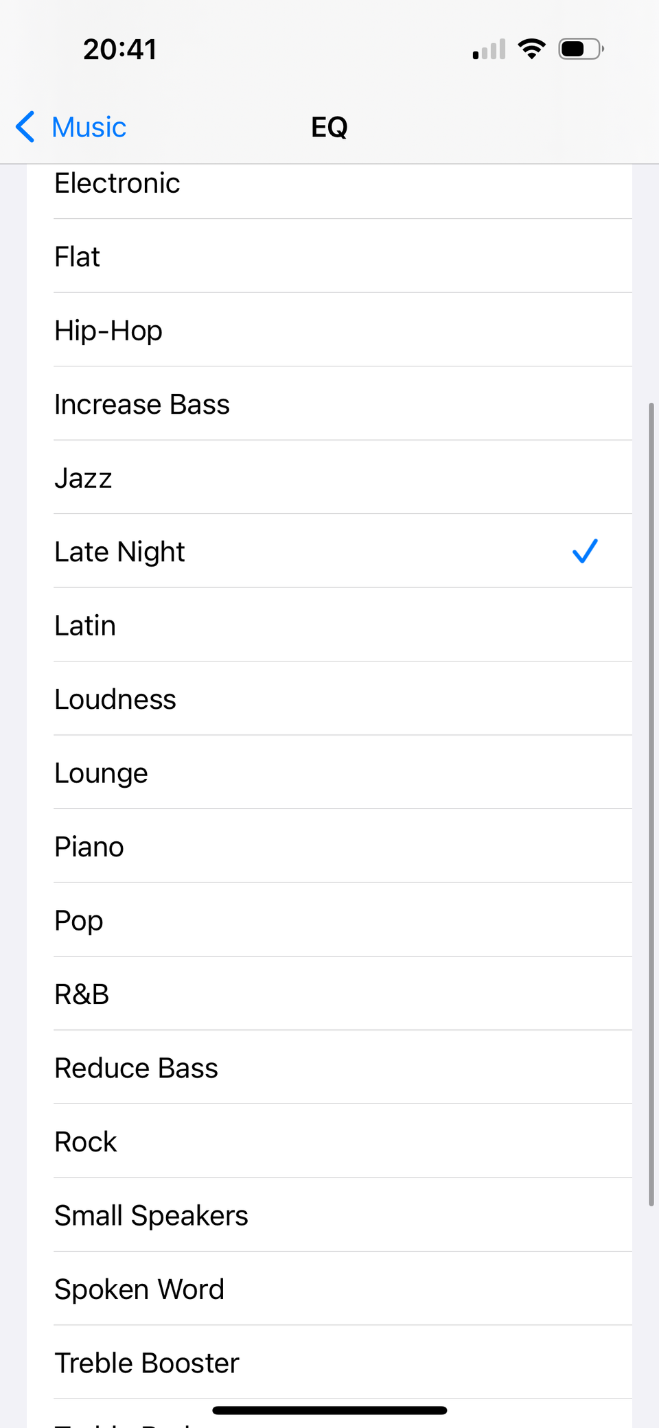 Head to Settings > Apps > Music > EQ. This is Off by default, but you can use it to accentuate certain sounds when listening to songs. Try switching it to Late Night. The mode compresses Dynamic Range, inverting audio so loud noises are reduced and quieter tones are amplified.