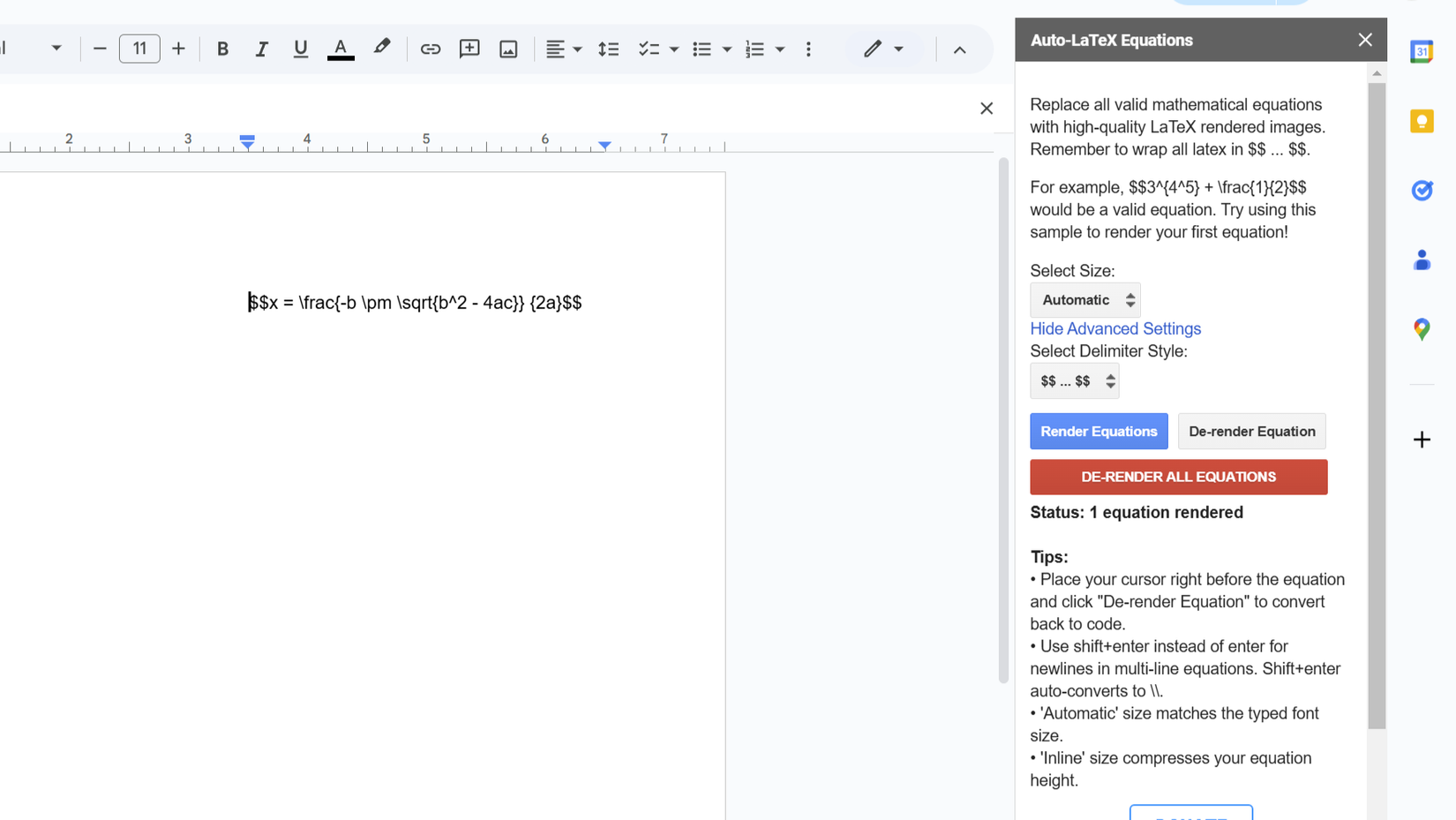 Once the add-on is installed, you can directly type LaTeX commands and render to create complex equations.