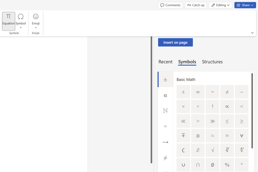 On the other hand, Microsoft Word's equation editor can also be accessed through the Equation button in the Insert tab. Upon clicking it, a sidebar appears, presenting various math symbols and structures under these two categories.