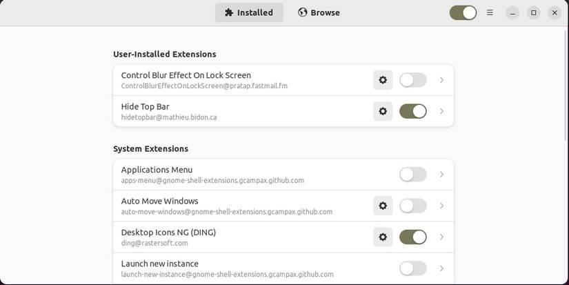 You can also customize the behavior of the Hidе Top Bar еxtеnsion. To do so, open GNOME Extension Manager, move to the Installed tab, and click on the gear icon next to the Hide Top Bar extension: