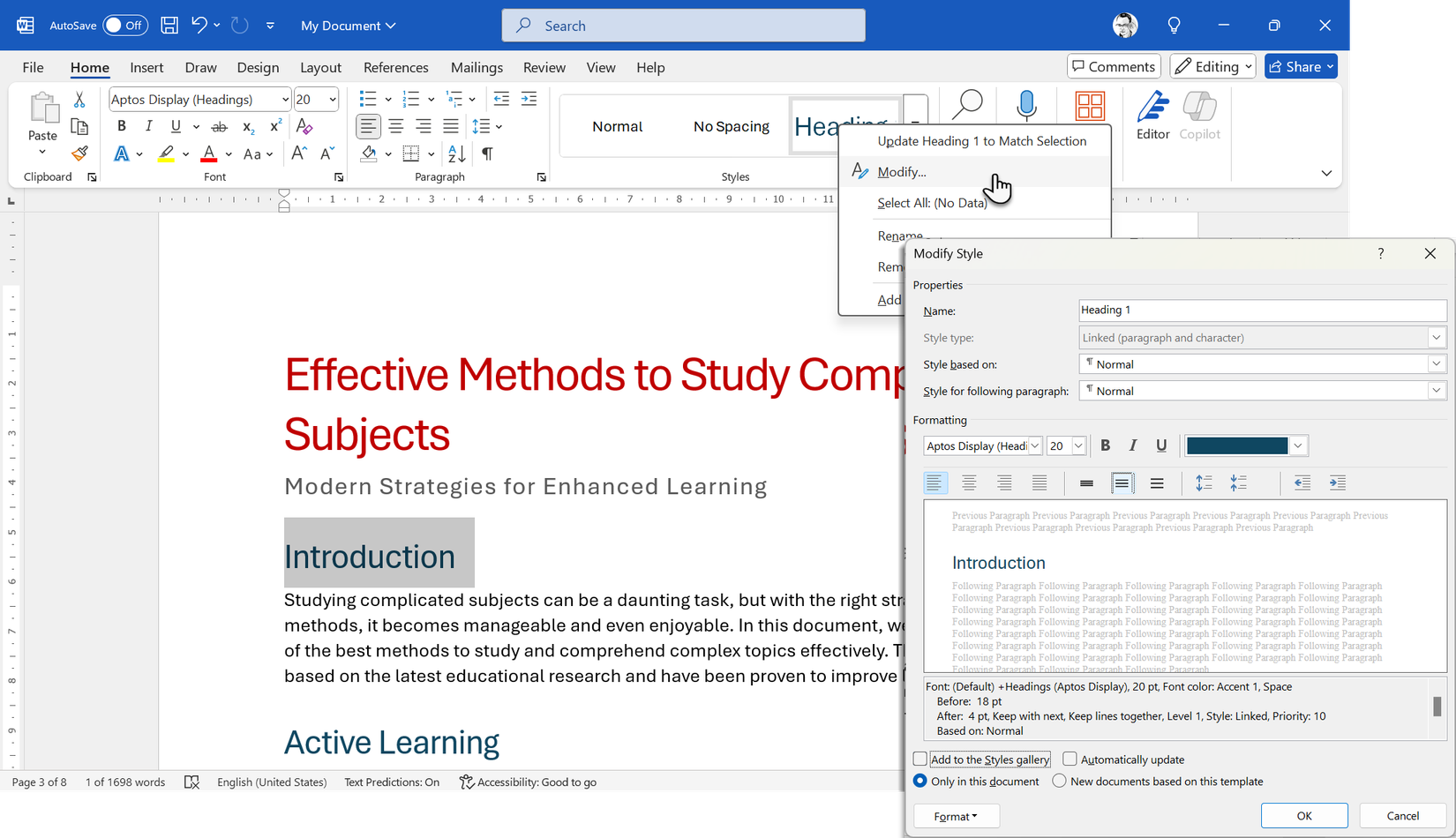 Go to the Styles group and right-click the style (e.g., Heading 2). Choose Modify to change the font, size, spacing, or color. Then, set your preferred Formatting.