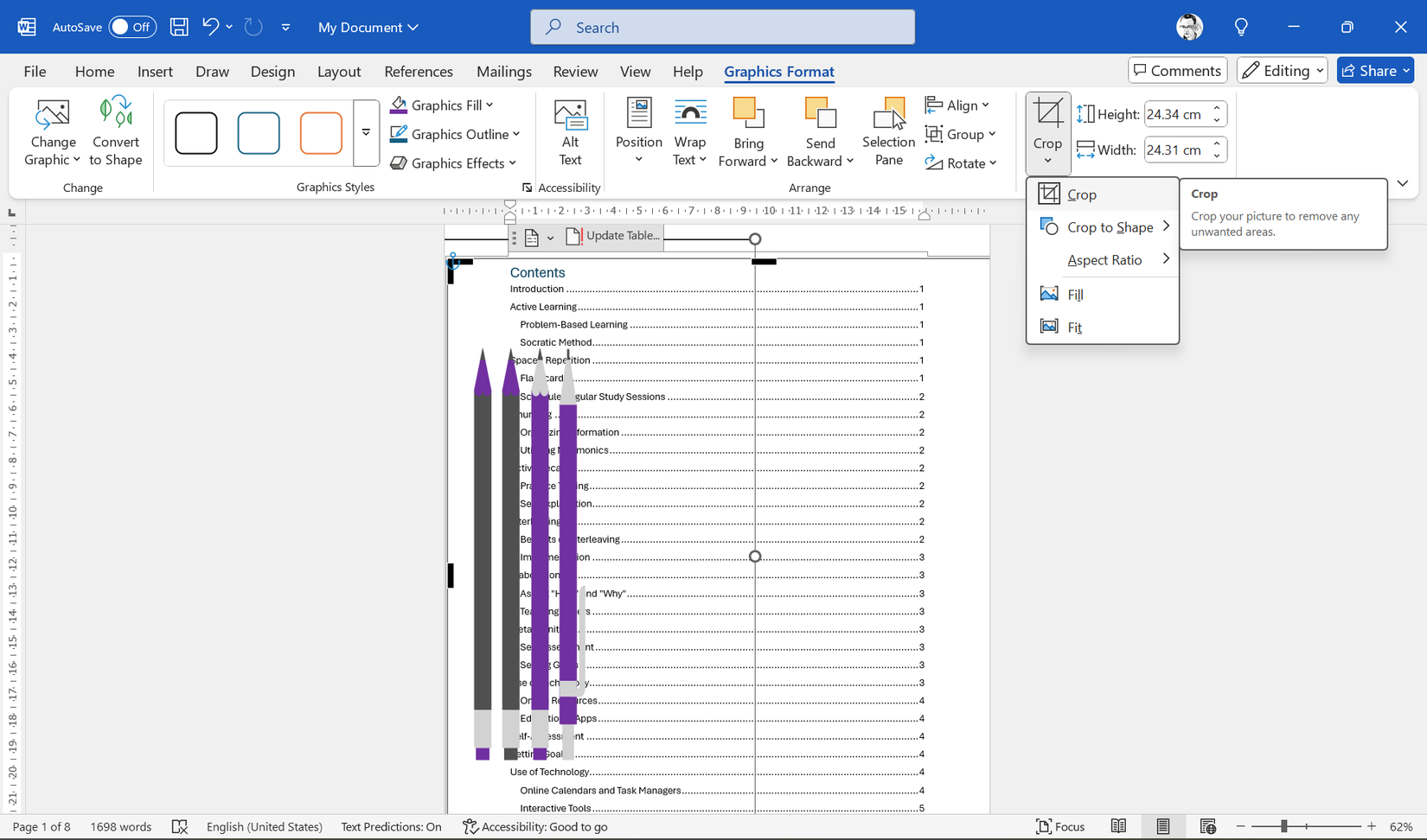Drag the corner handles on the image and arrange it to cover the entire ToC page. Go to Picture Format (or Graphics Format) > Crop and trim part of the image (as in the screenshot below). You will need to make a few creative decisions here depending on the nature of your inserted photo and the placement you want.