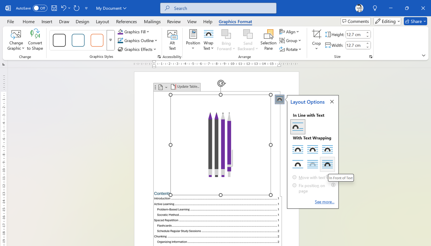 Select the Layout Options button (looks like an arc) next to the image. Then, click the In Front of Text option on the bottom right. The image will now "float" above the ToC text so you can easily move it around the page.