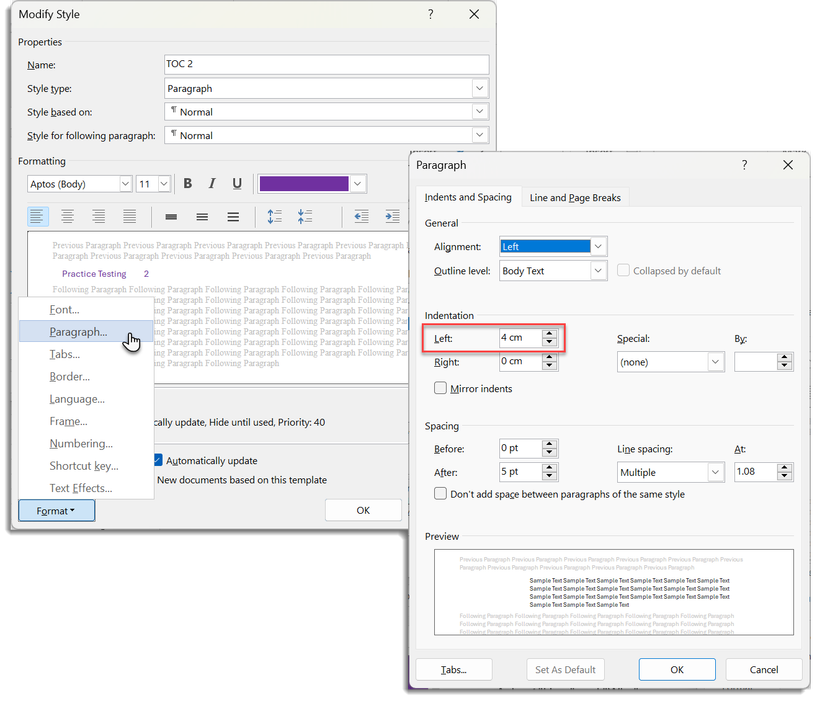 Click on Format. The Format menu reveals more ways to customize the layout. To move the ToC away from the photo, select Paragraph > Indentation. Enter a number in the Left field to shift the text. You must select each TOC level and indent them separately.