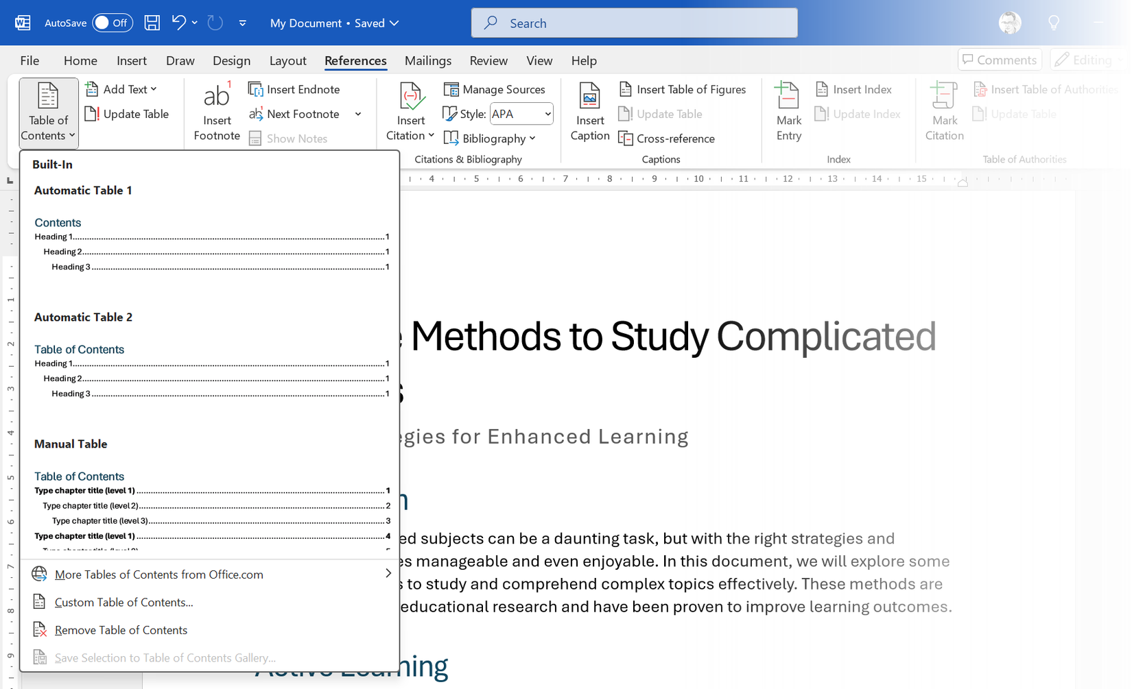 To pick a style, go to the References tab and click on Table of Contents. Word has several built-in styles, such as Automatic Table 1 or Automatic Table 2 and a Manual Table (which is more hard work!).