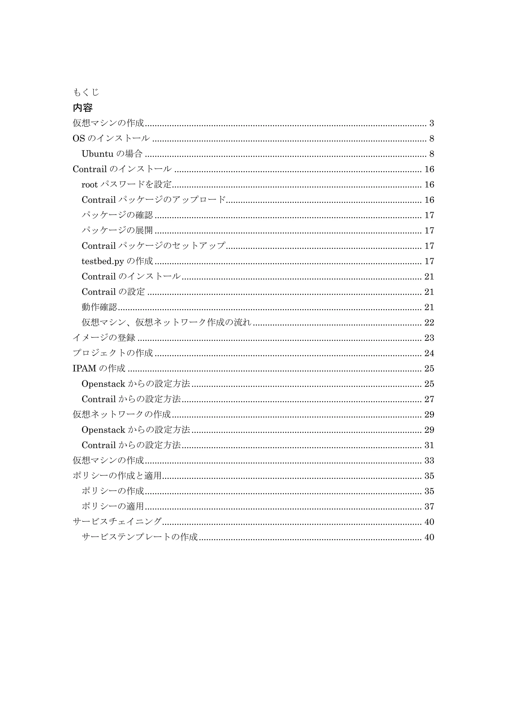 もくじ 内容 仮想マシンの作成................................................................................................................... 3 OS のインストール ................................................................................................................ 8 Ubuntu の場合 ................................................................................................................... 8 Contrail のインストール ..................................................................................................... 16 root パスワードを設定...................................................................................................... 16 Contrail パッケージのアップロード................................................................................ 16 パッケージの確認 ............................................................................................................. 17 パッケージの展開 ............................................................................................................. 17 Contrail パッケージのセットアップ................................................................................ 17 testbed.py の作成............................................................................................................. 17 Contrail のインストール.................................................................................................. 21 Contrail の設定 ................................................................................................................ 21 動作確認............................................................................................................................ 21 仮想マシン、仮想ネットワーク作成の流れ..................................................................... 22 イメージの登録 .................................................................................................................... 23 プロジェクトの作成 ............................................................................................................. 24 IPAM の作成 ........................................................................................................................ 25 Openstack からの設定方法.............................................................................................. 25 Contrail からの設定方法.................................................................................................. 27 仮想ネットワークの作成...................................................................................................... 29 Openstack からの設定方法.............................................................................................. 29 Contrail からの設定方法.................................................................................................. 31 仮想マシンの作成................................................................................................................. 33 ポリシーの作成と適用.......................................................................................................... 35 ポリシーの作成................................................................................................................. 35 ポリシーの適用................................................................................................................. 37 サービスチェイニング.......................................................................................................... 40 サービステンプレートの作成........................................................................................... 40