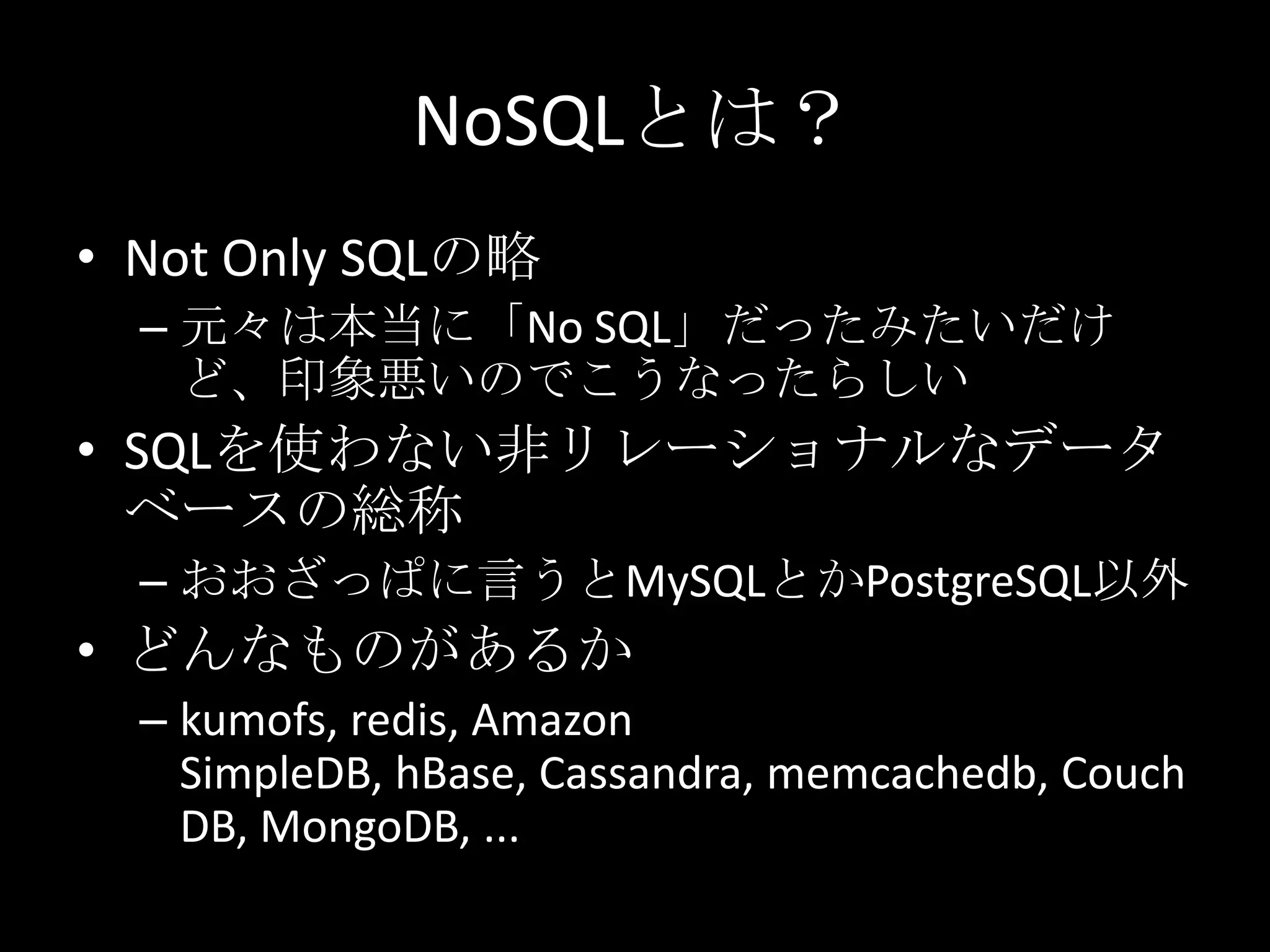 NoSQLとは? • Not Only SQLの略 – 元々は本当に「No SQL」だったみたいだけ ど、印象悪いのでこうなったらしい • SQLを使わない非リレーショナルなデータ ベースの総称 – おおざっぱに言うとMySQLとかPostgreSQL以外 • どんなものがあるか – kumofs, redis, Amazon SimpleDB, hBase, Cassandra, memcachedb, Couch DB, MongoDB, ...