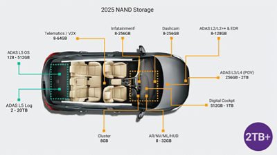 ADAS systems need to collect, store, analyze, process, and transmit large amounts of information about complex road conditions and the driving environment in real time. With the progression from assistance systems to autonomous systems, the number of sensors continues to increase, and the amount of collected information is skyrocketing. Similarly, In-vehicle infotainment (IVI) systems are transforming into massive screens and human-like interfaces managed by a Digital Cockpit system that controls everything from external communication (V2x) to internal HMI and entertainment with extensive demands on large and fast storage.