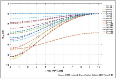 USB4 Gen2 10Gbps and USB4 Gen3 20Gbps use one of 16 presets. The frequency response for the 16 presets for USB4 Gen3 20Gbps are shown in Figure 2. Preset0 is linear frequency response while preset 15 is approximately half the amplitude for low insertion loss channels. This prevents the receiver from being overdriven.