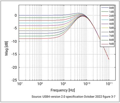 USB4 Gen2 10Gbps and Gen3 20Gbps have even larger number of RX boost settings. The reference receiver defines 10 different settings and 1-tap DFE but again, actual implementations might use 3-tap DFE for better performance. Figure 3 shows the frequency response of the USB4 Gen3 20Gbps reference Continuous Time Linear Equalizer (CTLE).