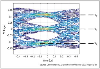 To decode PAM-3 signals, an additional slicer is needed to decode two eyes. See figure 4 for a typical PAM-3 signal and the defined signal levels. For PAM-3, the ideal slicing levels are between V0 and V1, and between V1 and V2. For USB4 v2 Gen4 40Gbps, the reference receiver is defined in a way that allows actual implementations to fit each vendor’s proprietary technology.
