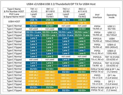 Table 1 shows the USB-C lane usage and USB4 v2 PHY configurations for legacy USB, DisplayPort, Thunderbolt, USB4 and USB4 v2. An even more complex USB4 v2 PHY is required for USB4 v2 re-timer which adds DisplayPort RX and reverse asymmetric mode (40Gbps TX and 120Gbps RX) support.