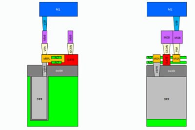 Front-end-of-the-line and middle-of-the-line cross sections of a single transistor in a 3nm design as envisioned by the FreePDK.