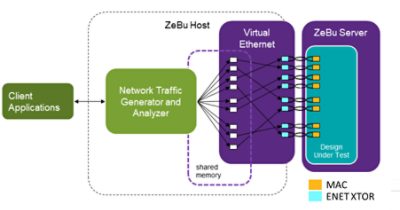 In this solution, networking devices from the design under test (DUT) are connected to ZeBu® transactors that are serviced by virtual ports from third-party testers through Virtual Ethernet.