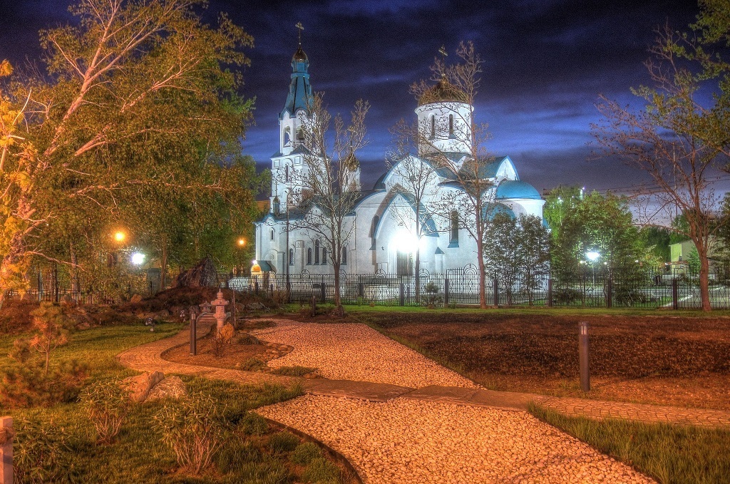 ↓その<北海道センター>の庭と<復活主教座聖堂>が見える辺りを、日が落ちた後の午後10時台に通り掛かりました。